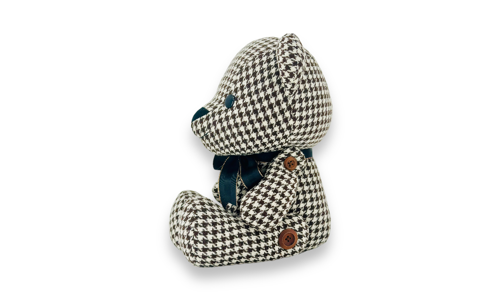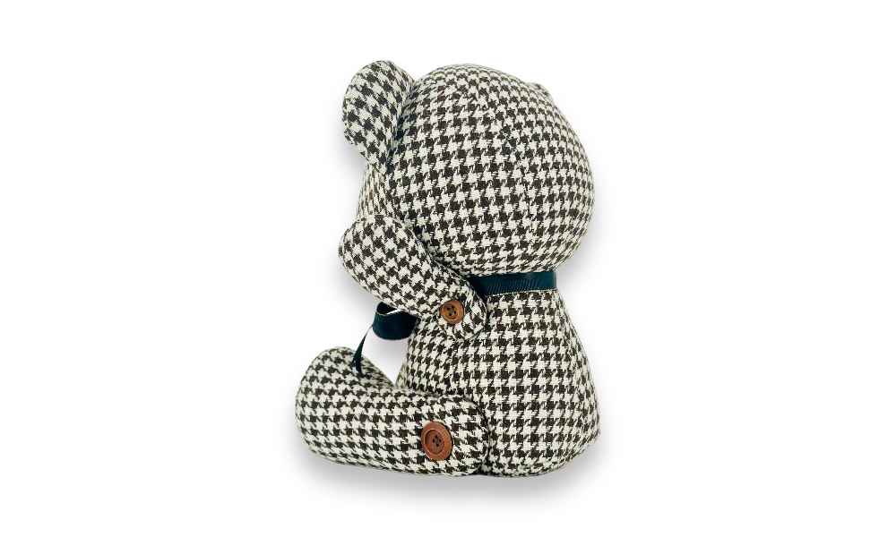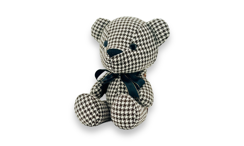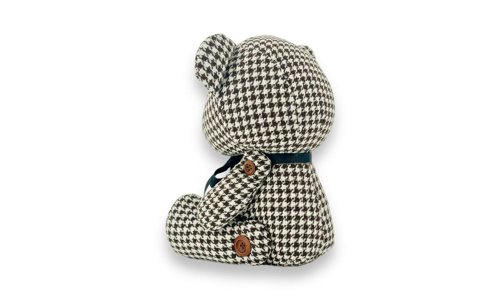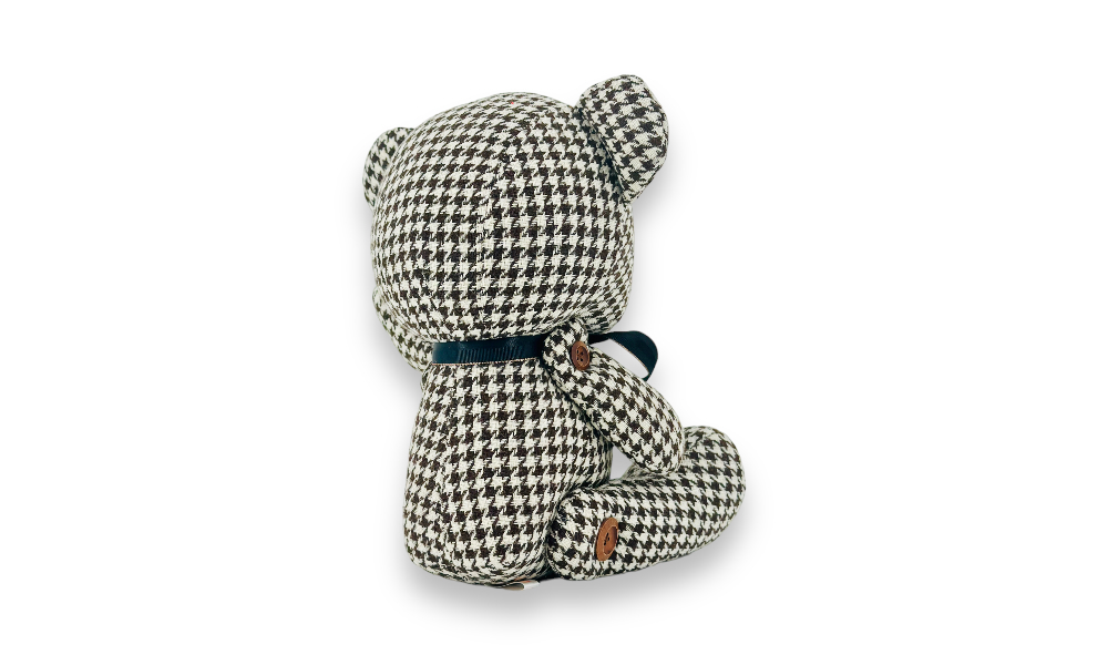 「歐比邁國際開發有限公司為您帶來經典格調的熊,擁有令人難以忘懷的水鳥格紋布料。嚴選千鳥格紋布料,經細緻手工製作,紮實的棉花填充營造出豐富柔軟觸感,呈現俐落的外型。特色之處在於木制鈕扣縫制的四肢關節,賦予熊更多活潑生動的可能性。每一縫每一針,都是對品質的極致追求。歡迎與我們一同享受這份精緻和獨特的格調。」