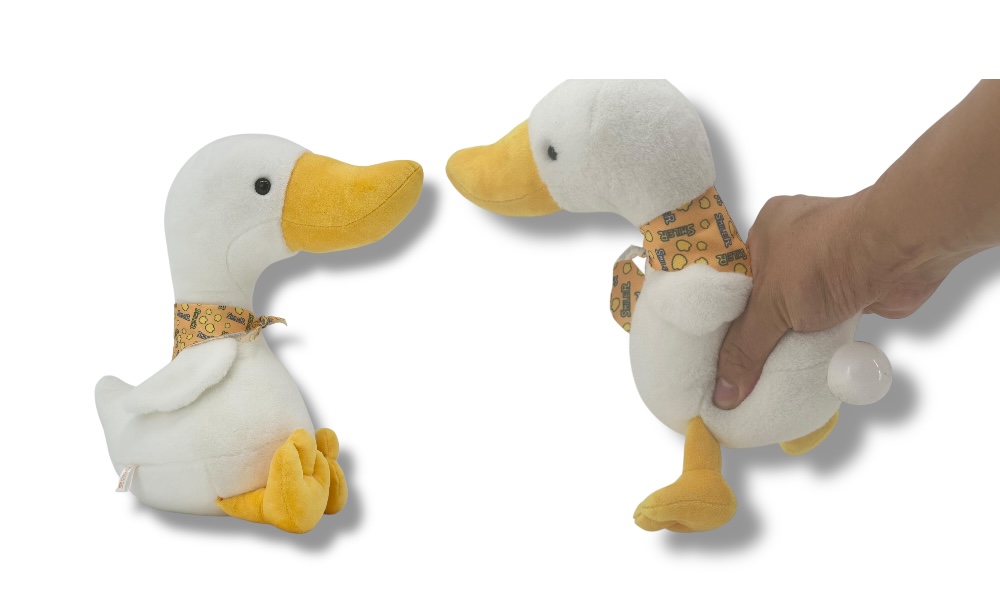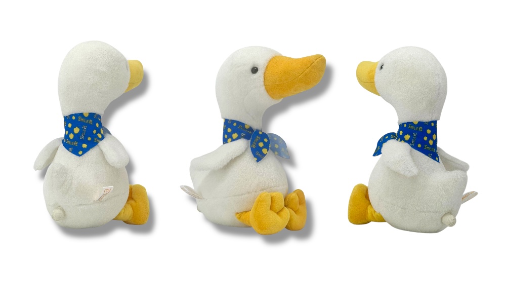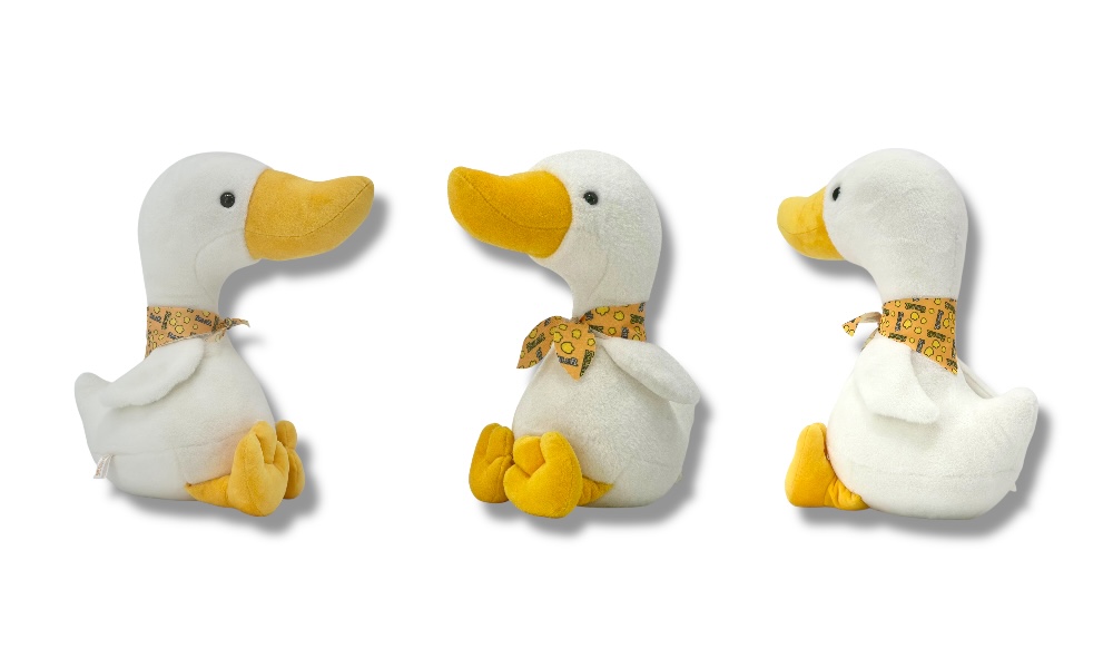 搭配黃色與藍色的連續印花領巾,展現俏皮可愛的氛圍,讓鵝鵝不只是玩偶,更是陪伴小夥伴。